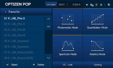 OPTIZEN POP共提供4種測(cè)量模式 (光度測(cè)量模式, 定量模式, 光譜模式, 動(dòng)力學(xué)模式), 用戶可根據(jù)測(cè)量目的選擇使用相應(yīng)的模式。用戶可以利用設(shè)備中內(nèi)置的電腦軟件和觸屏界面, 應(yīng)用程序來(lái)簡(jiǎn)便地使用設(shè)備。