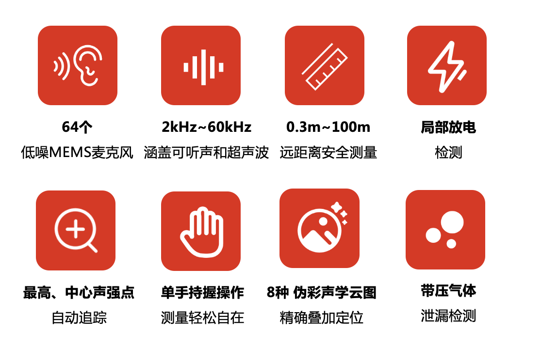 聲學成像原理 聲像儀——又名聲學相機,是利用聲傳感器陣列測量一定范圍內的聲場分布的專用設備。可用于測量物體發出的聲音的位置和聲音輻射的狀態,將采集的聲音以彩色等高線圖譜的方式可視化呈現在屏幕上,有效的測量聲場分布,聲場圖與可見光的視頻圖像**疊加,形成類似于衛星云圖的圖像,對故障位置,故障特性,強度進行顯示。 ![]()